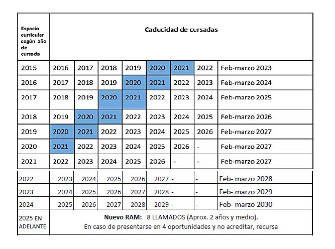 Información para alumnos 24/12/2024 Estimados/as estudiantes: Según el RAM nuevo Res N°4196/24 el/la estudiante que quiera presentarse como LIBRE puede hacerlo en cualquier llamado a partir del año 2025 en adelante. CADUCIDAD DE CURSADAS